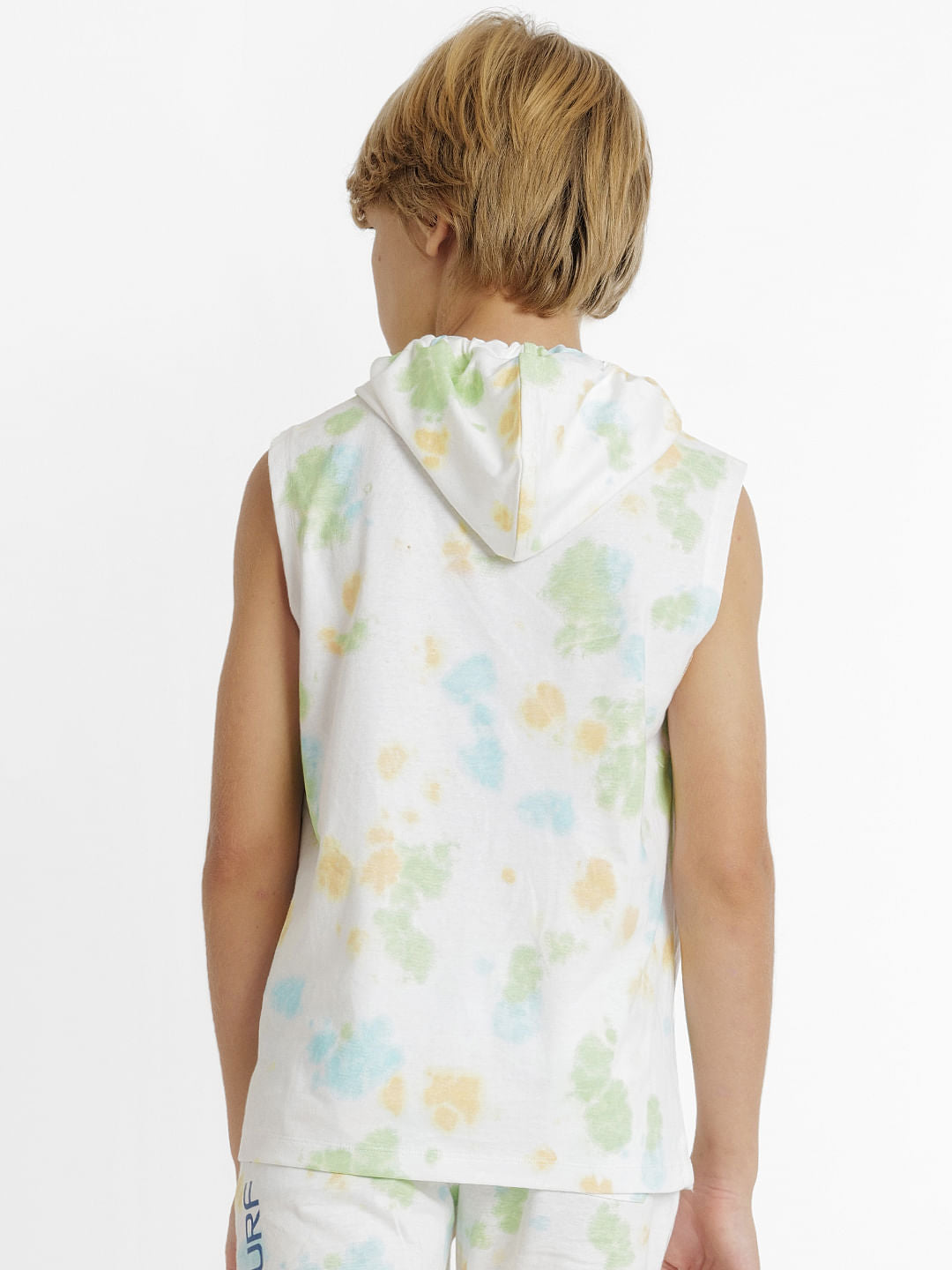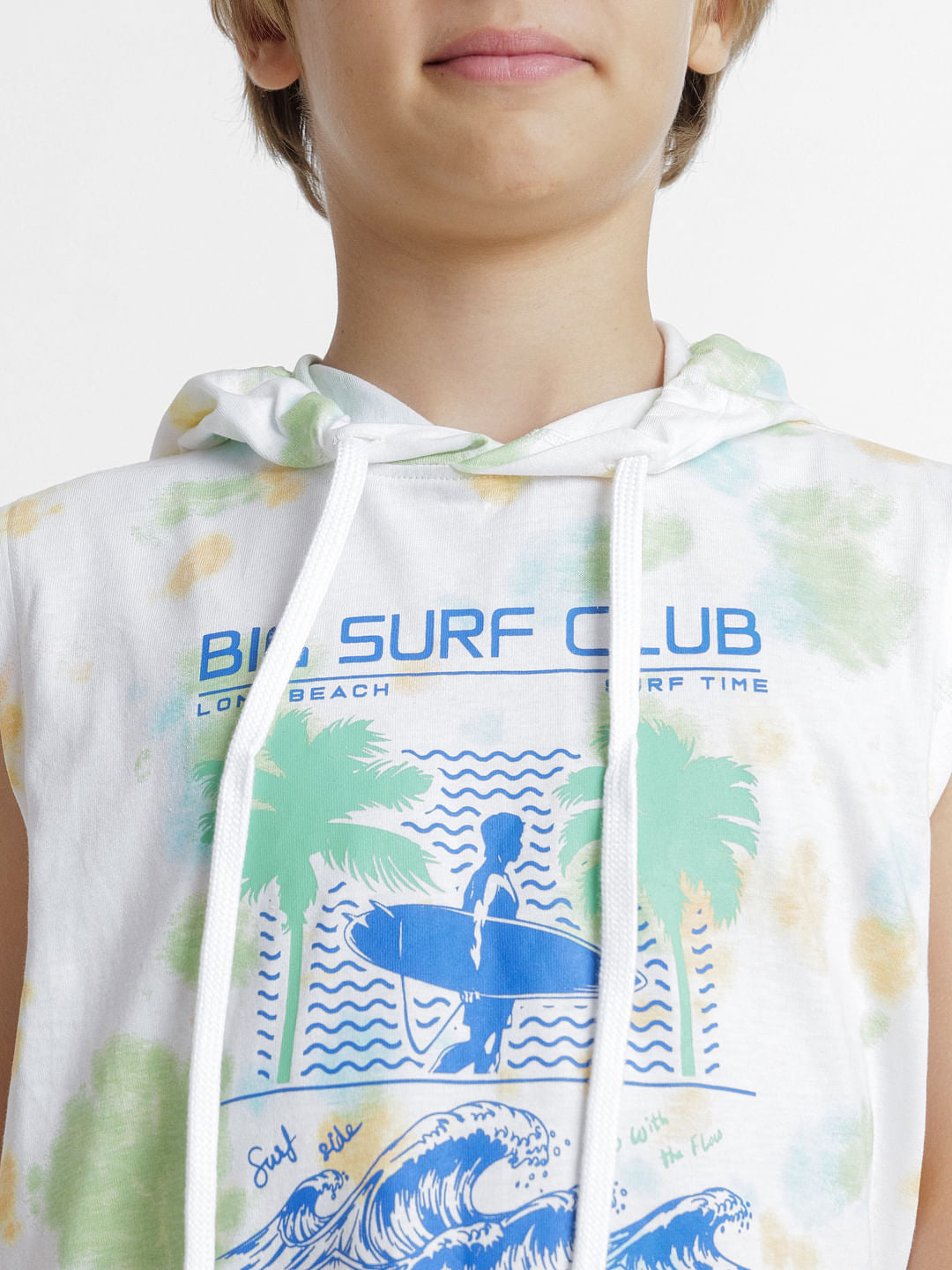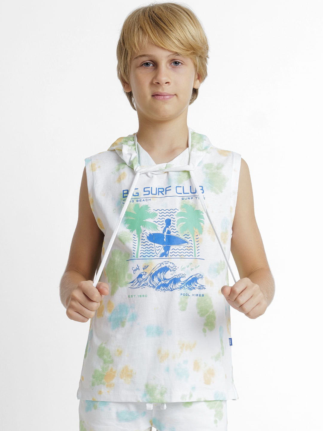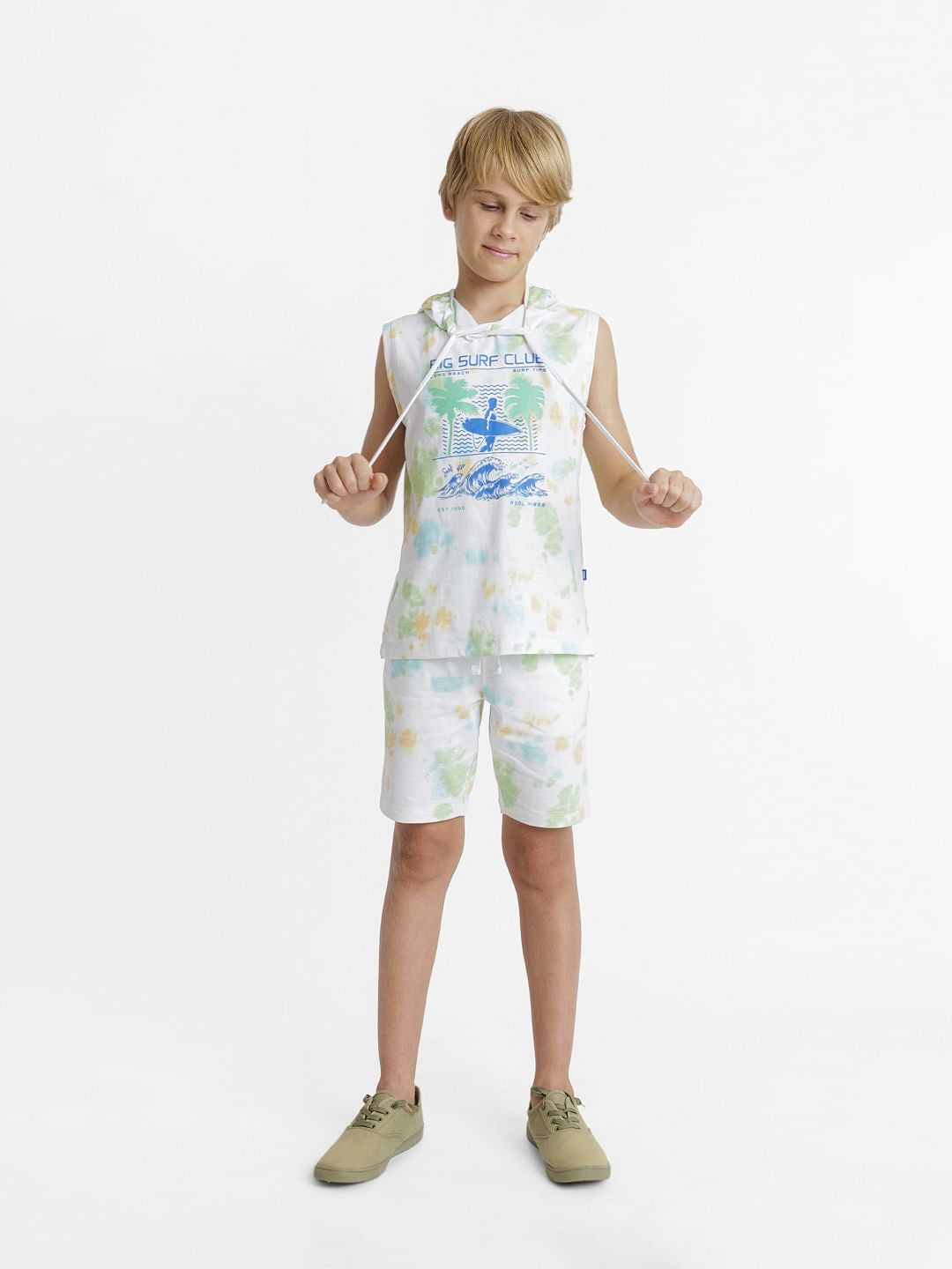 100% Cotton co-ord set hooded tee for little boys. Features an all over tie dye print and typographic text, drawstring at the hood. Style it with our matching sweatshorts and sneakers for a summer day out!