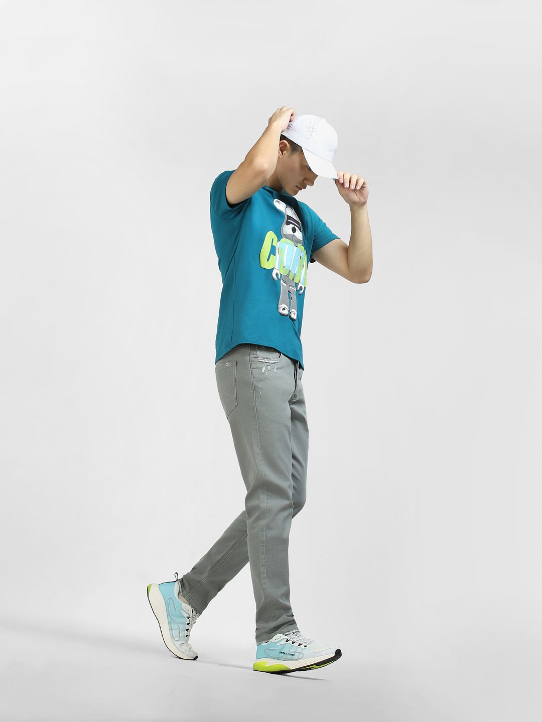 Men's low rise slim fit jeans in a distressed look and washed green colour. Features classic front & back pockets and belt loops. Made from premium cotton-stretch fabric for a good fit. Perfect to wear with tees, casual shirts, sweatshirts, etc.