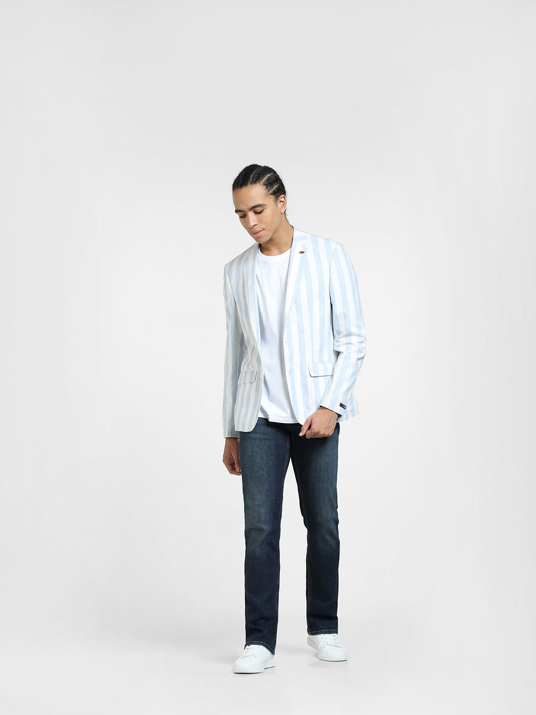 Men's casual cotton-linen blend blazer rendered in a classic striped print. Cut in a slim fit with a double button closure, notched lapel collar, welt pockets, and features a nautical blue and white colour.