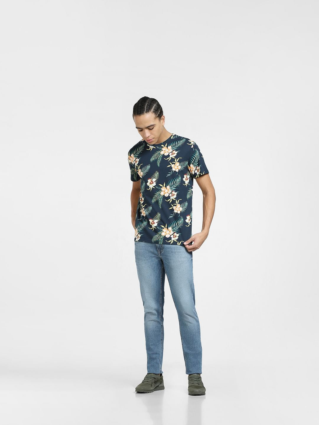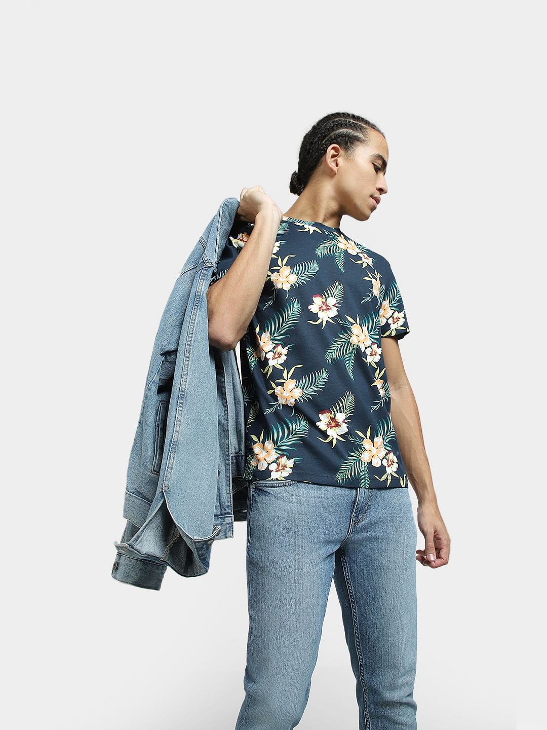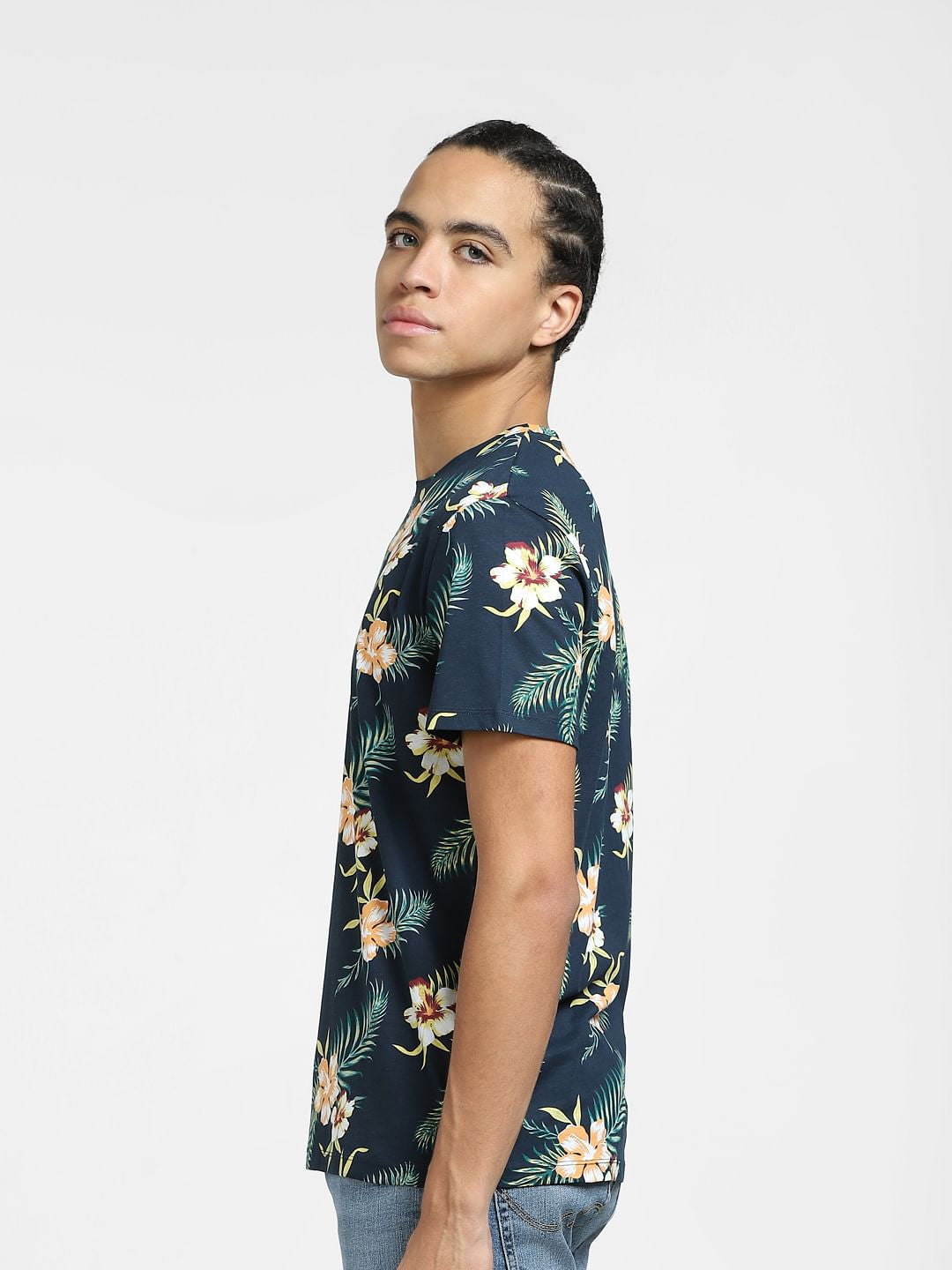 Men's 100% cotton crew neck tee with a tropical print. Pair with jeans and sneakers for a dapper look.