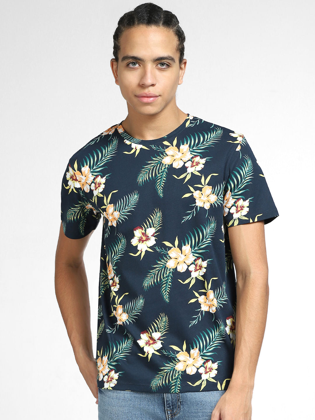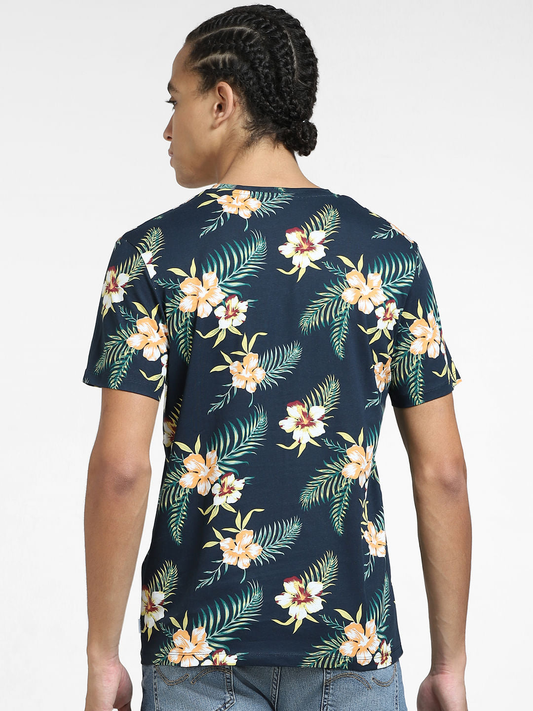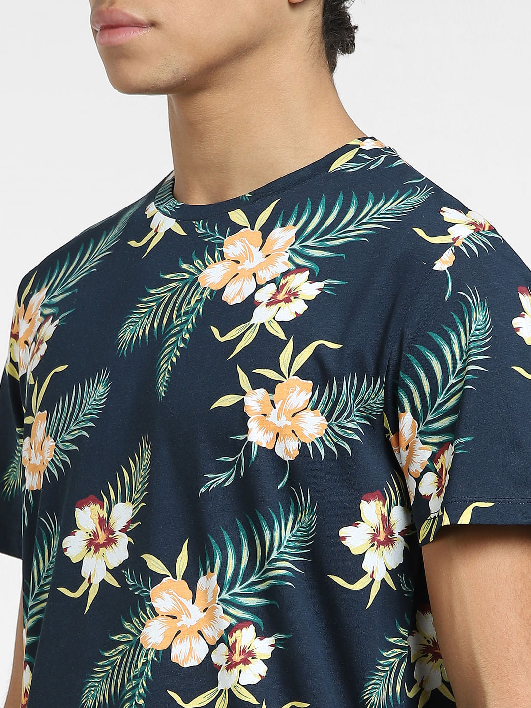 NAVY BLUE TROPICAL PRINT CREW NECK T-SHIRT