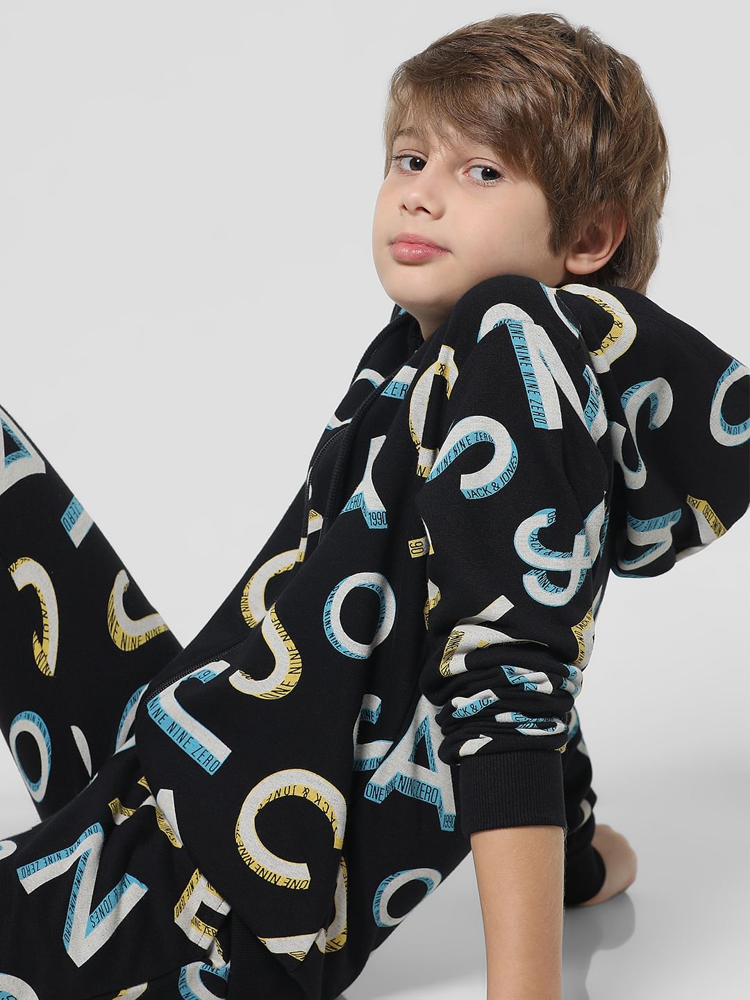 Classic hooded front open sweatshirt for little boys. Made from premium quality fabric and features a hood along with an all over typographic print that gives it added edge. Style it with our matching sweatpants and sneakers for a super cool athleisure vibe!