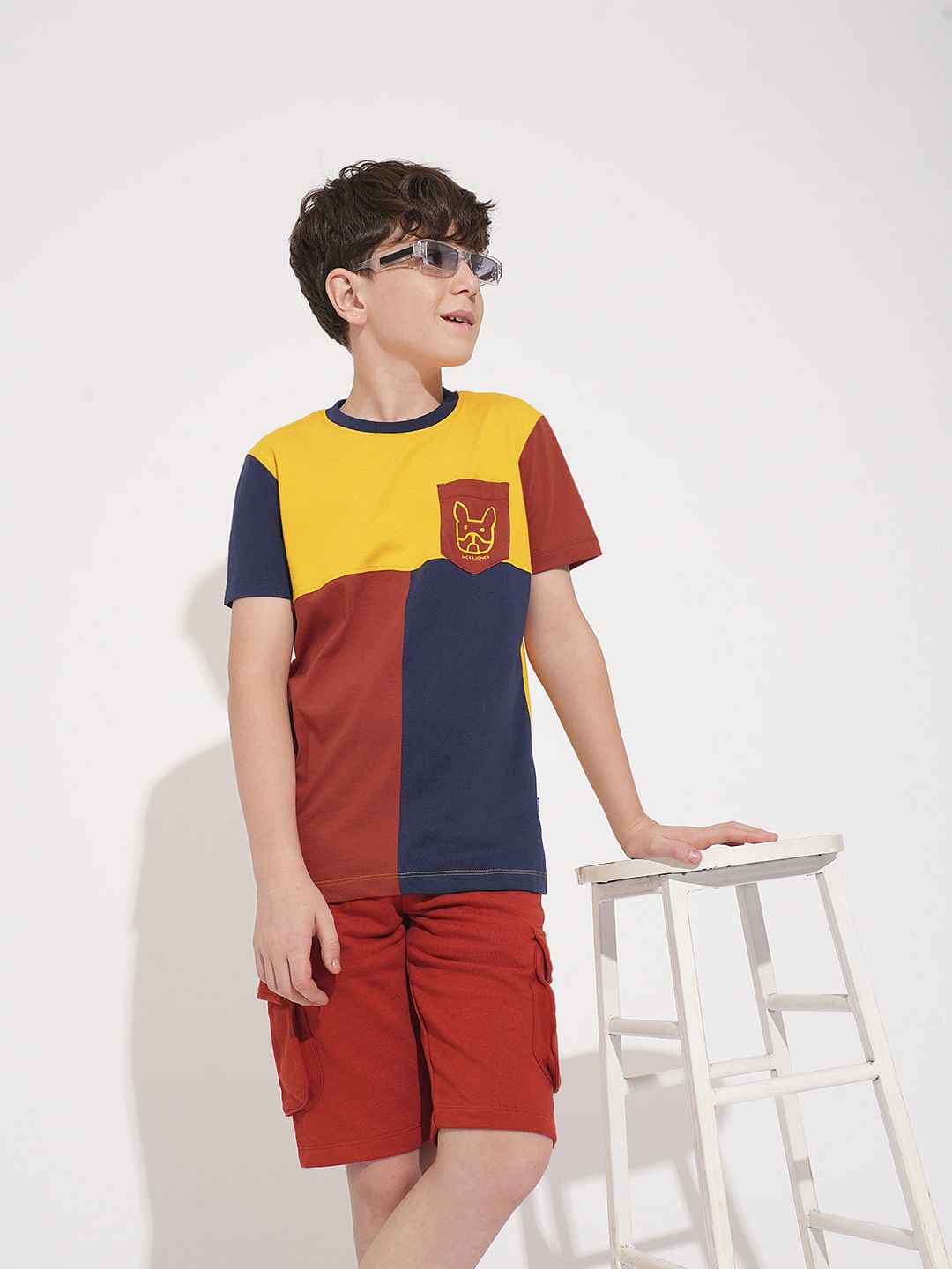 Get ready to level up your little champ's style game with this Yellow Colourblocked T-shirt! Crafted from super soft cotton, it's all about comfort and coolness. The bold chest branding adds just the right amount of attitude to keep your kid looking effortlessly trendy. Style Note: Pair this T-shirt with his favourite denim shorts and sneakers for a look that’s perfect for playdates or weekend adventures!