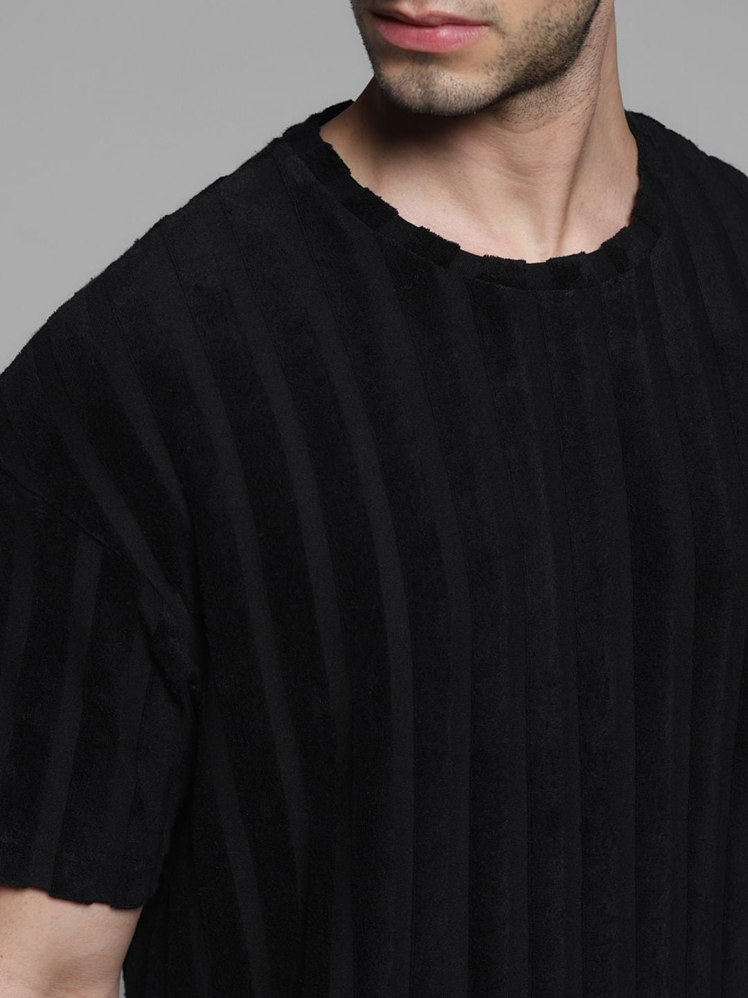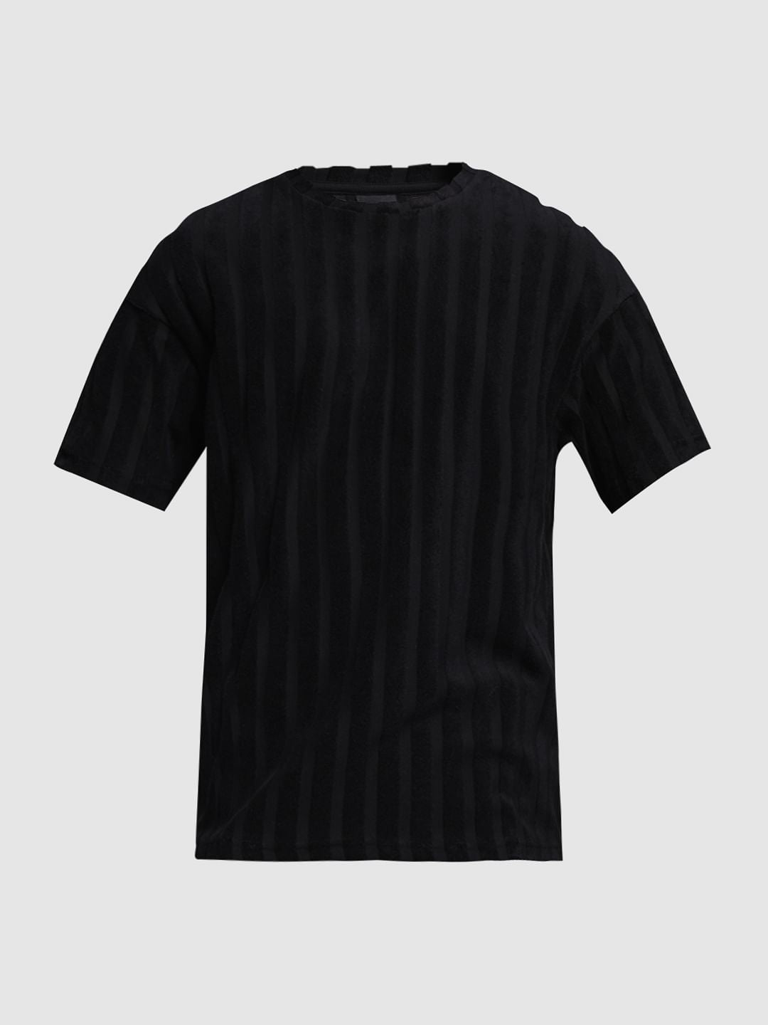 Men's black striped crew neck t-shirt in an oversized fit.
