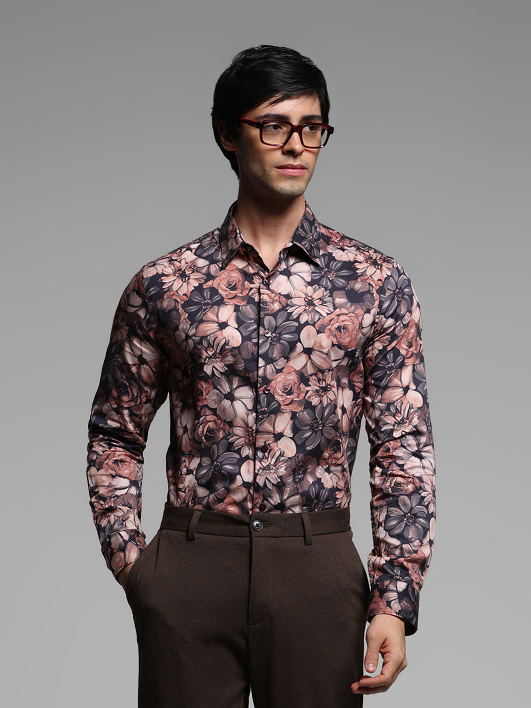 BROWN FLORAL COTTON FULL SLEEVES SHIRT