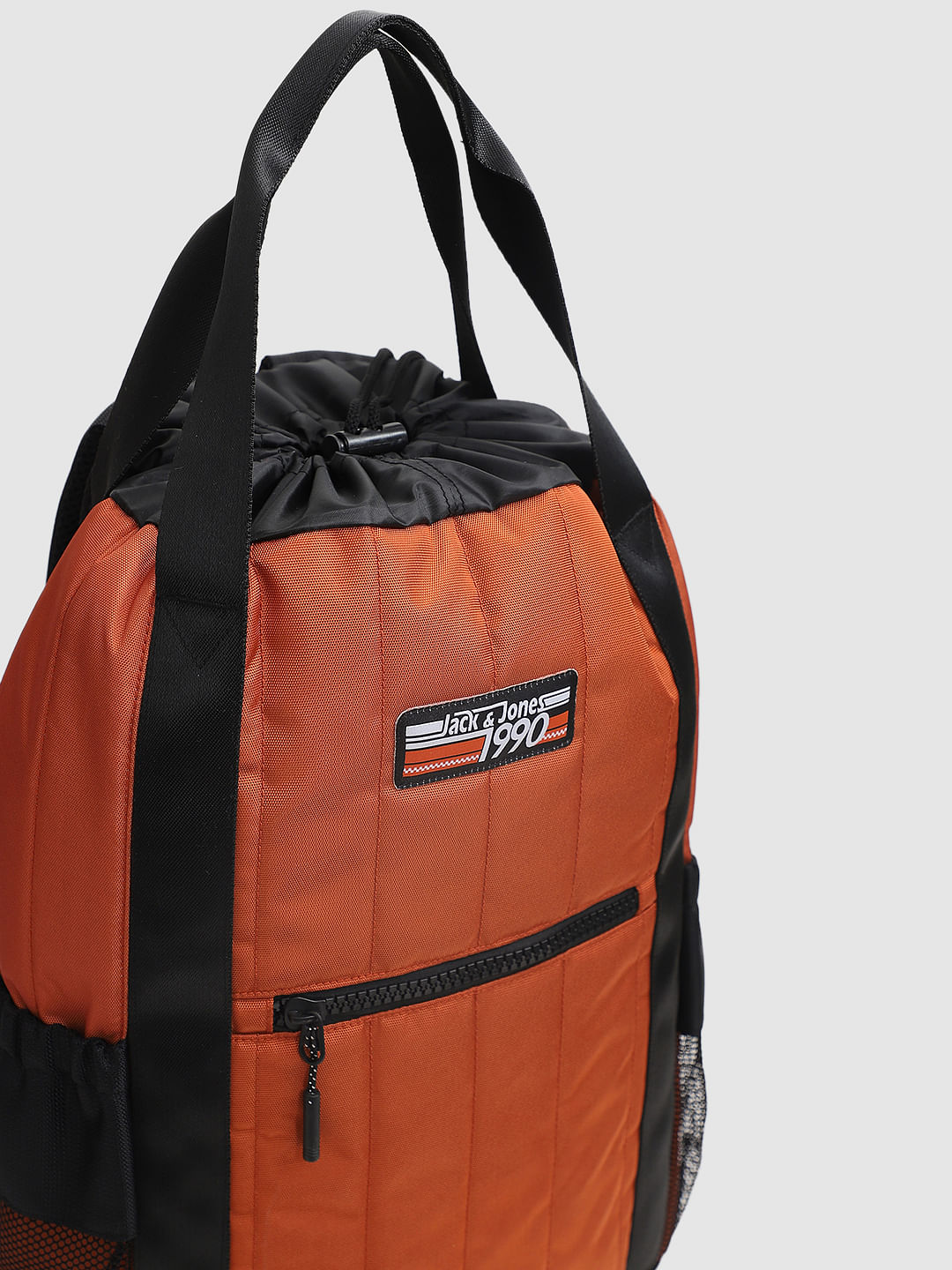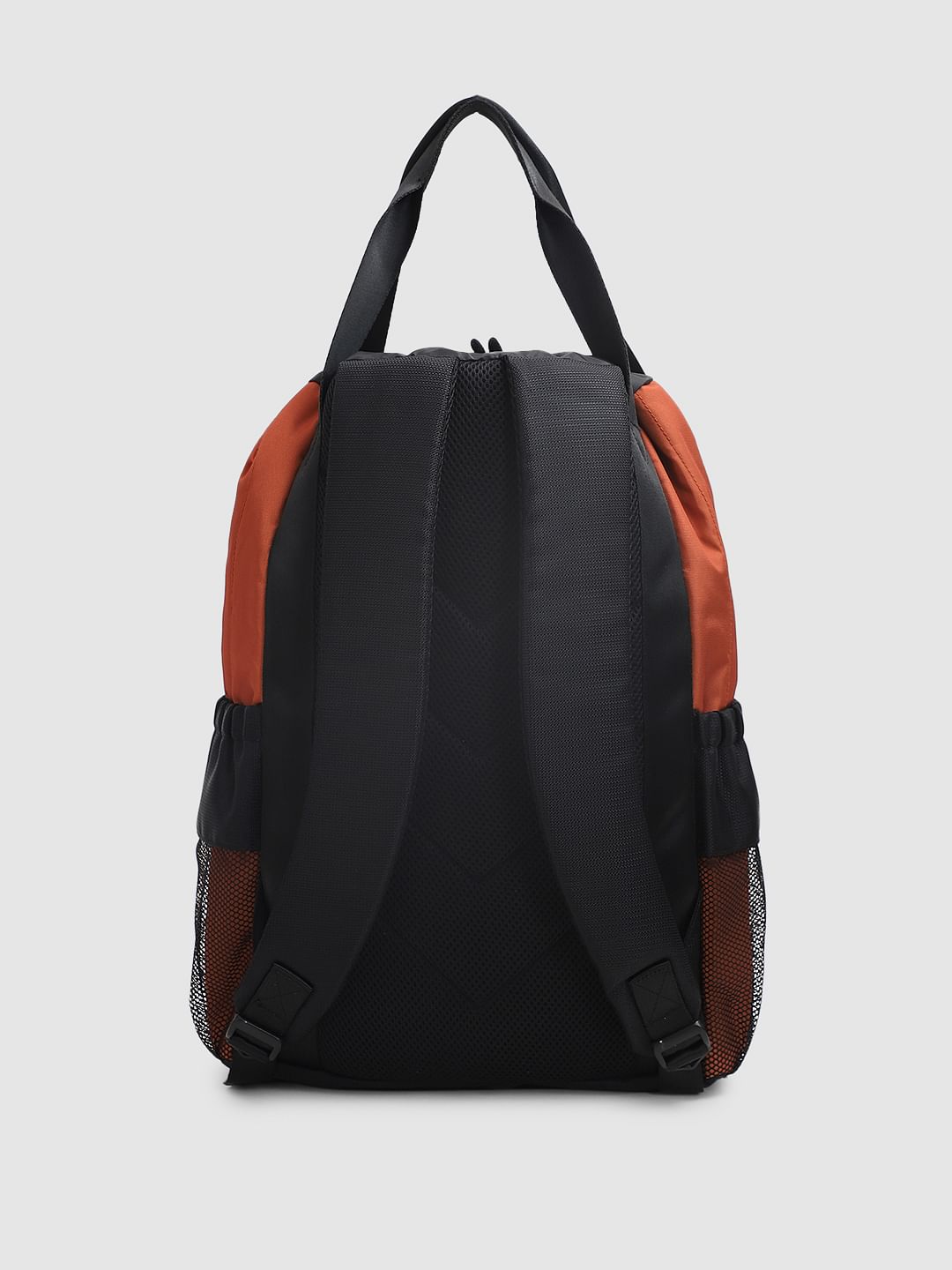 Men's utility backpack made from premium quality fabric and rendered in a stylish orange and black hue. Features mesh side pockets for liquids, front zip closure and a spacing inner compartment with an adjuster closure on top, adjustable shoulder straps that offer utmost comfort, and embroidered logo patch on the front for added edge.