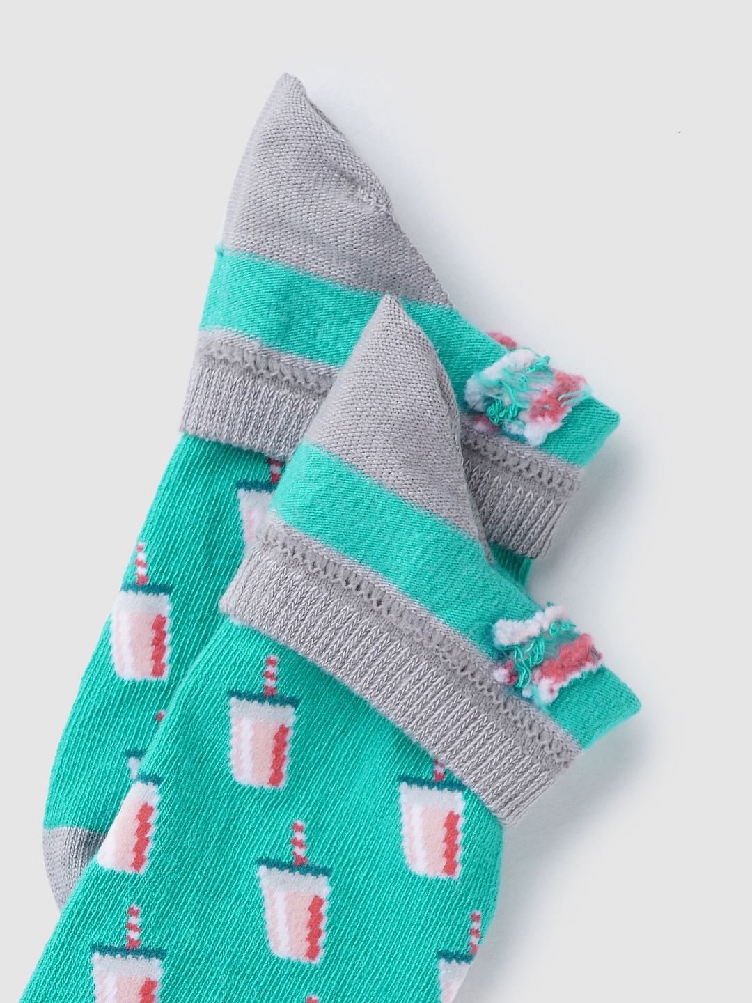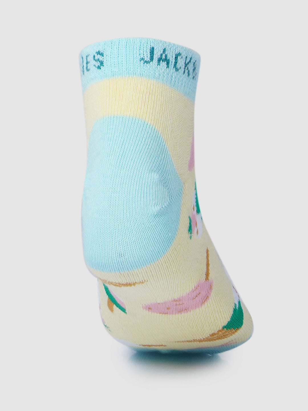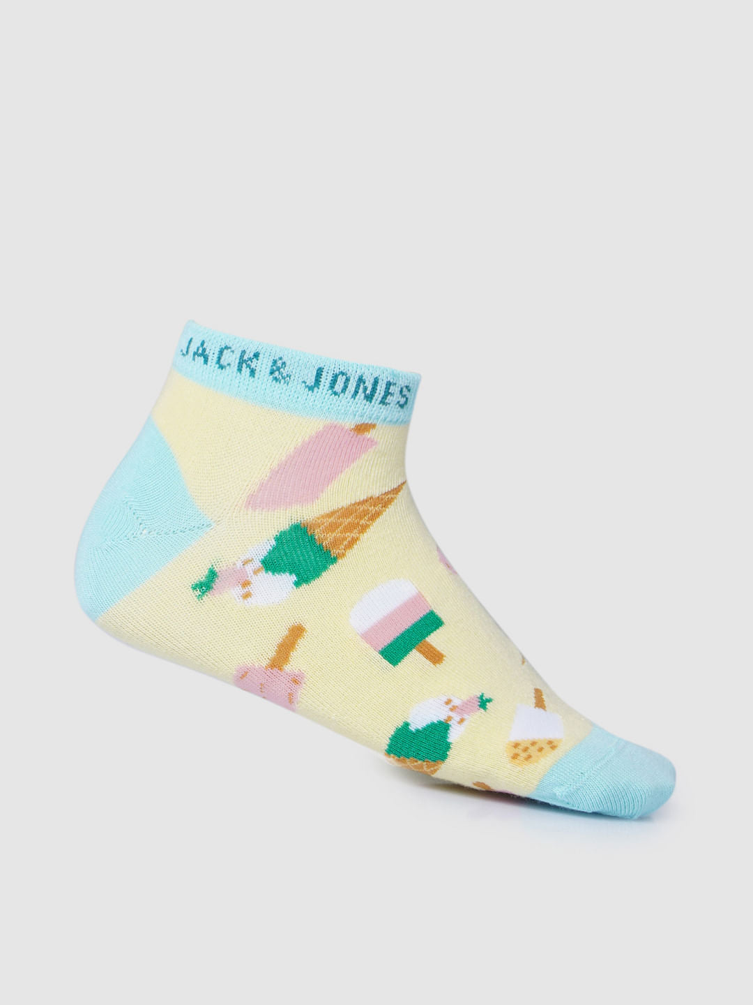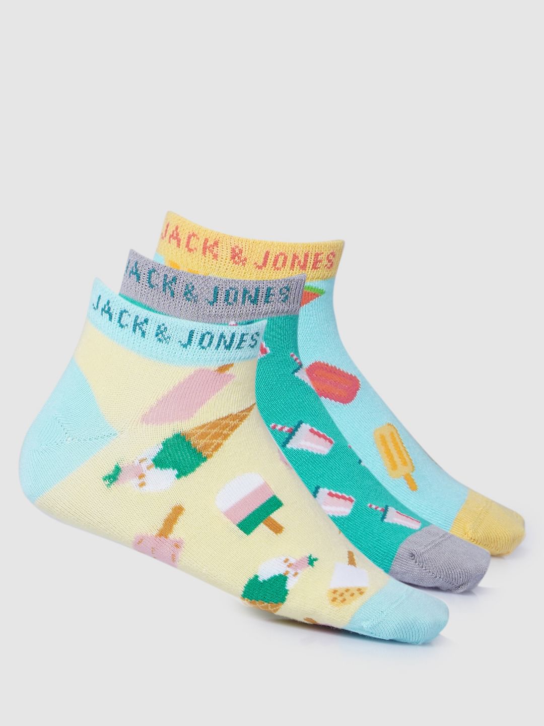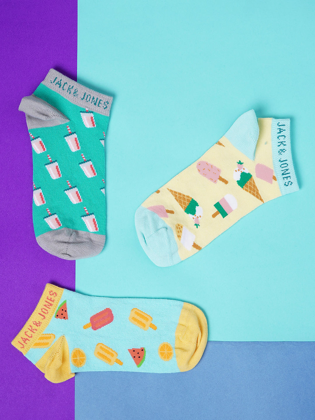 Pack of 3 ankle length printed socks. Colour: Yellow, blue, green.