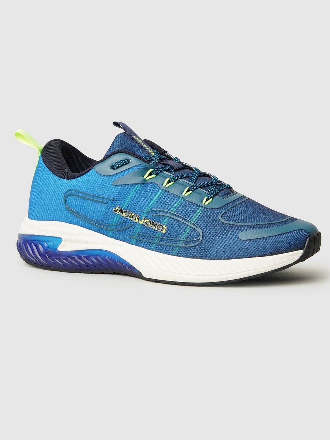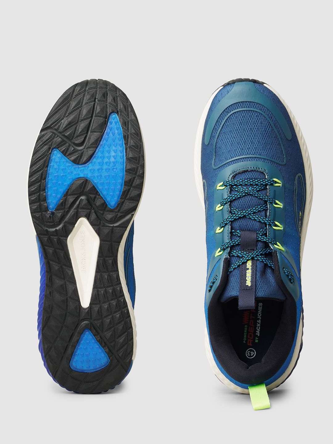 Men's blue lightweight sneakers with breathable mesh, lace-up closure, neon tint detailing, stylish logo branding, fluid-looking sole. Offers a good grip and has a comfortable sole