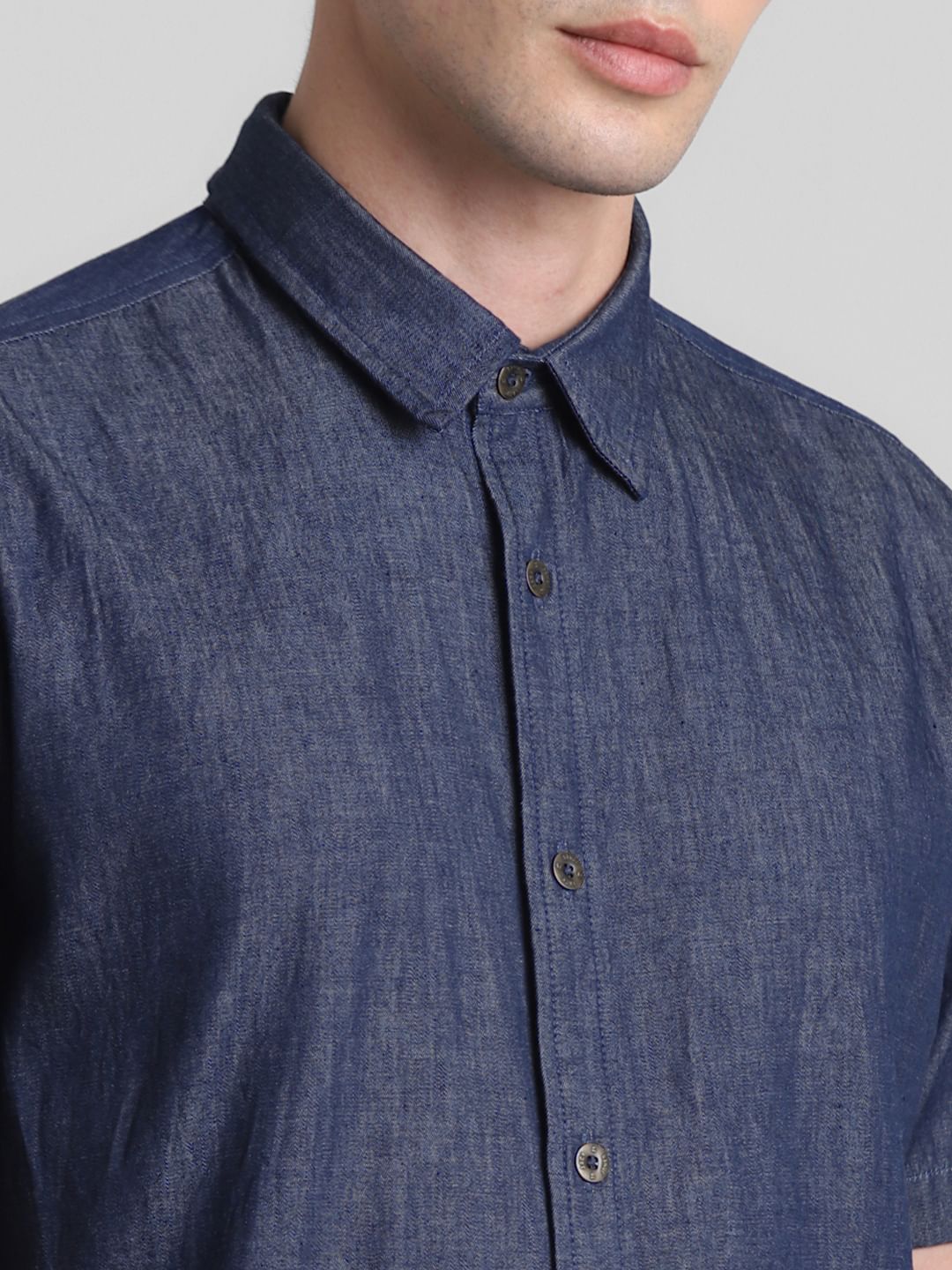 Dive into urban cool with our cotton denim short sleeves shirt, featuring a solid print. Designed for the modern trendsetter, this regular-fit shirt exudes effortless style. The front button closure adds a touch of sophistication, making it the perfect fusion of comfort and flair. Style note: Pair with denim and your favourite sneakers for an instantly chic street-ready look.