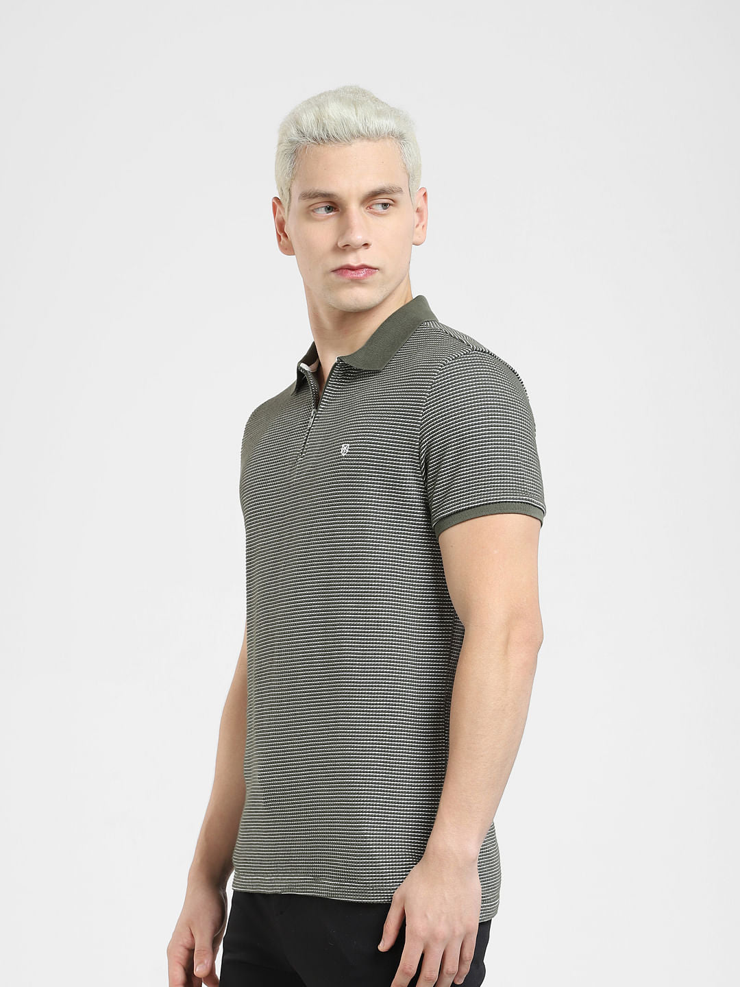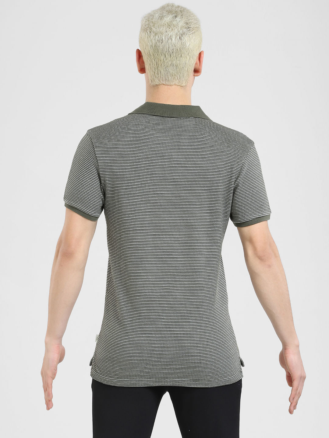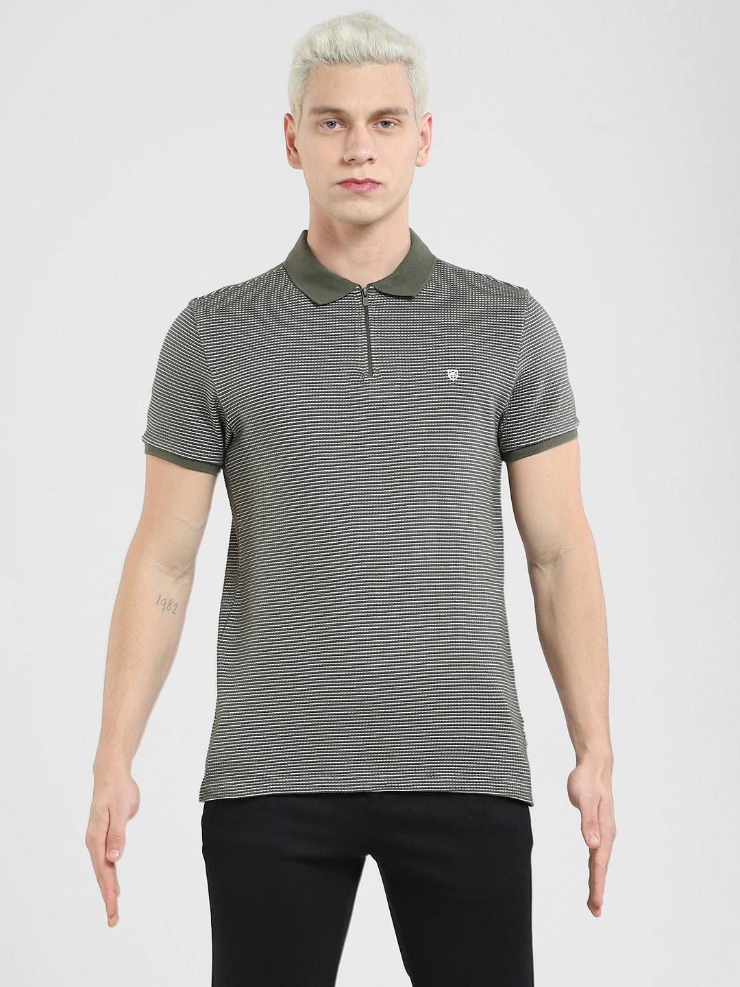 Men's 100% cotton zip-up polo neck t-shirt in a self-design print, short sleeves, and slim fit. Perfect to wear with shorts and sneakers.
