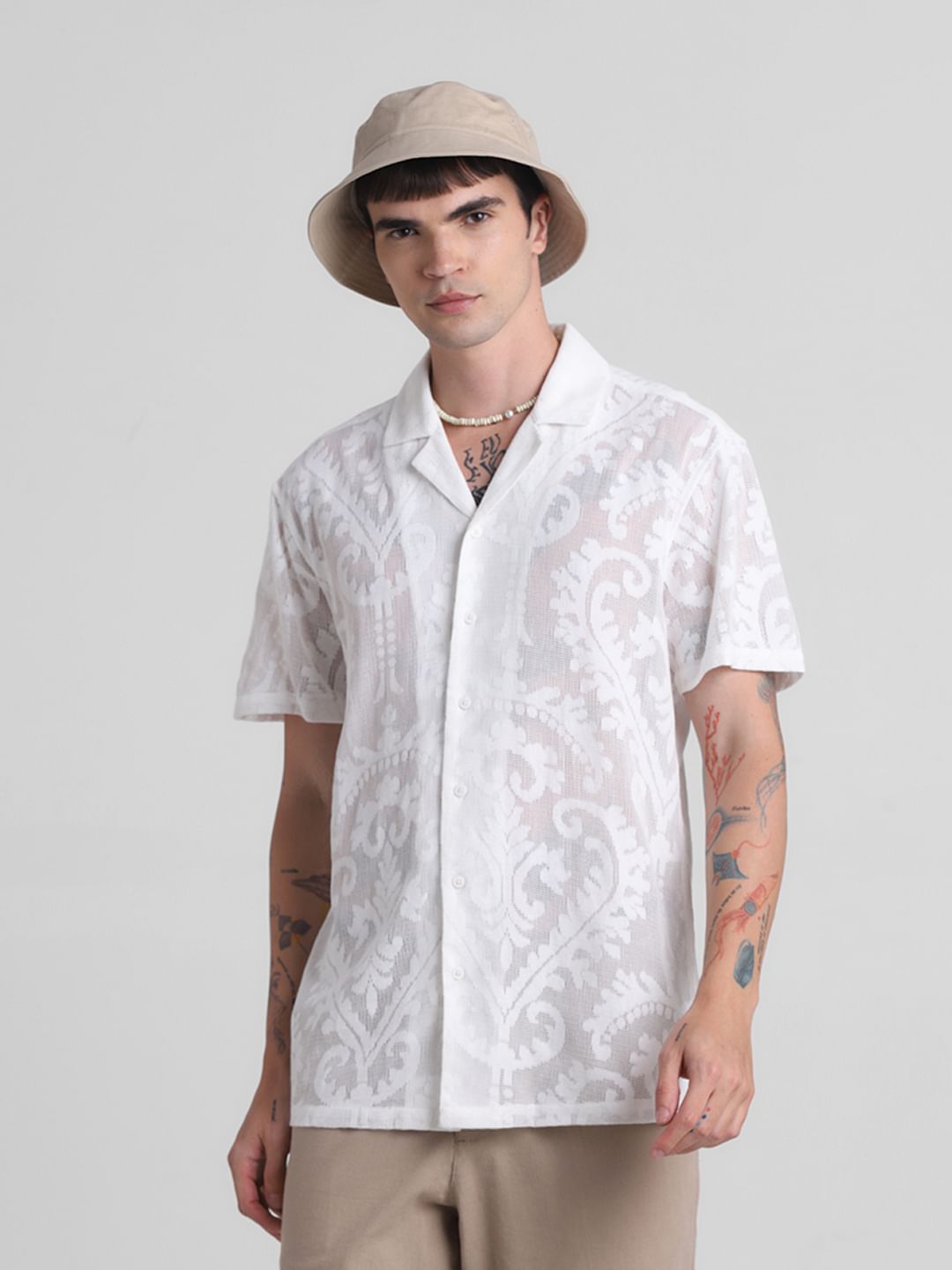Men's 100% cotton shirt rendered in an embroidered textured sheer fabric. Has a classic front button closure, shirt collar, and short sleeves. Style it with shorts and a bucket hat for the perfect summer vibe!