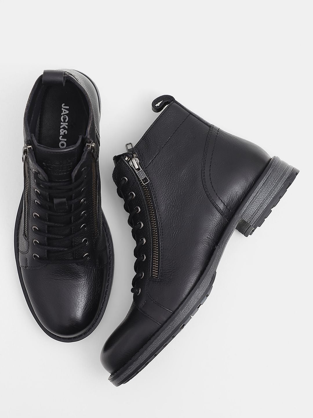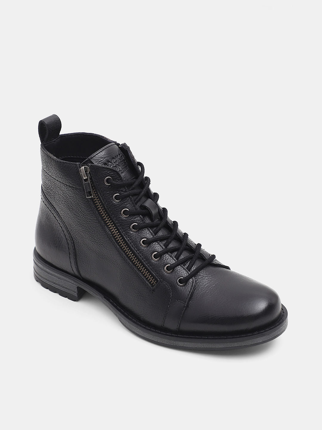 Classic men's black boots made from 100% Leather. Offers a premium look with a vintage, retro edge. Designed with side chain detailing, lace-up closure, high-quality sole for a good grip. Comfortable for all-day wear. Can be styled with a shirt and jeans.