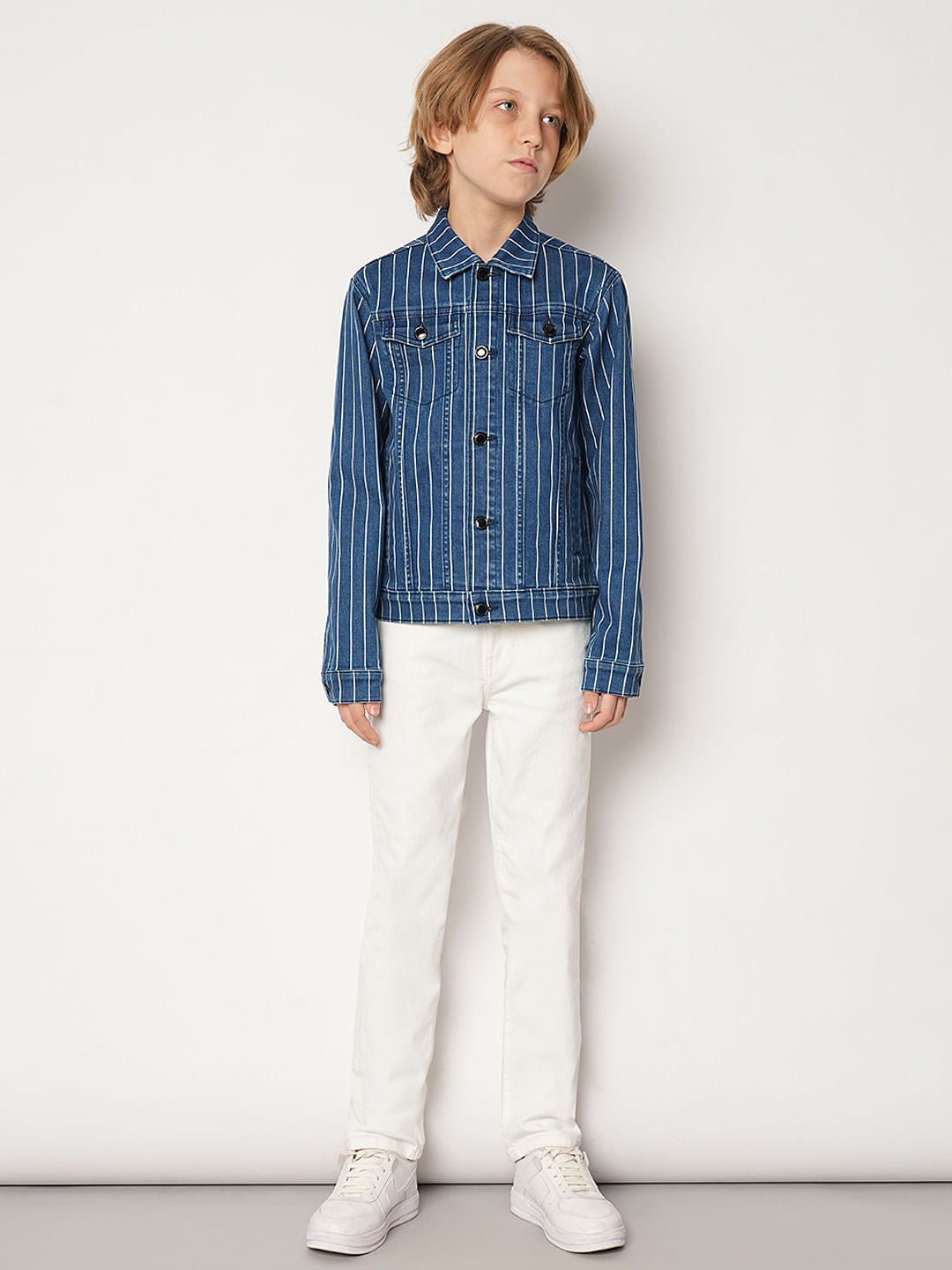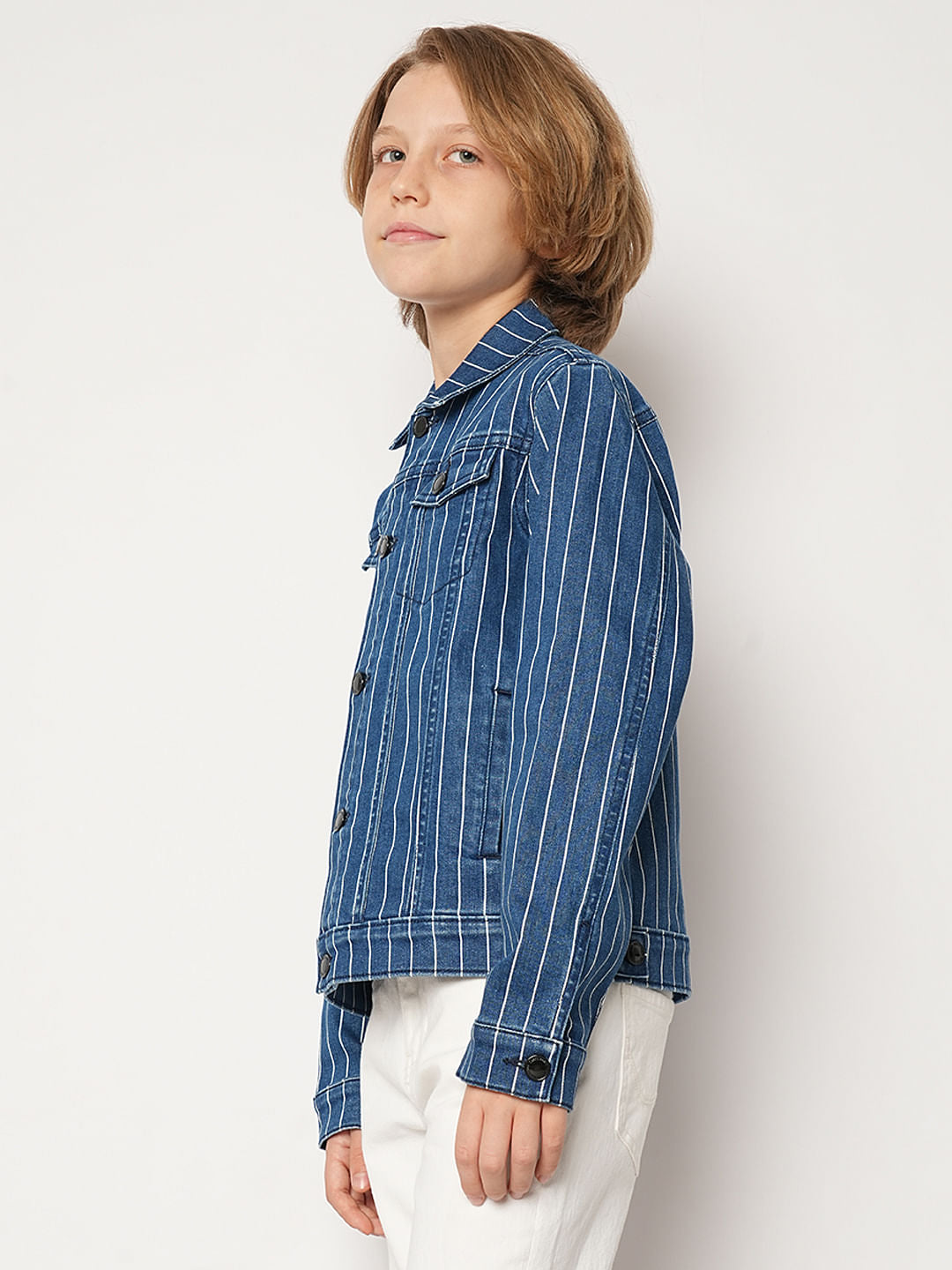 Introducing our super cool BLUE STRIPED Cotton Denim Jacket – the must-have fashion piece for your little dudes! This jacket is designed to bring some serious style to their wardrobe with its awesome features. The front button closure adds a touch of trendiness, making it easy for your little ones to showcase their unique style. The chest pockets not only amp up the cool factor but also provide a handy spot for stashing tiny treasures or snacks. Crafted from comfortable and durable cotton denim, this jacket is ready to handle the rough and tumble of playtime while keeping your mini fashionista looking effortlessly cool.