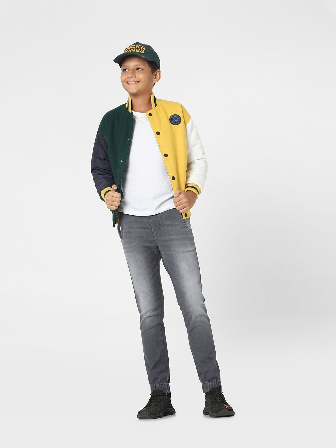 Grey mid rise jogger styled jeans for little boys. Made from premium quality cotton fabric and is designed with side pockets, drawstring waist, and subtle washed effect. Style with a tee and sneakers.