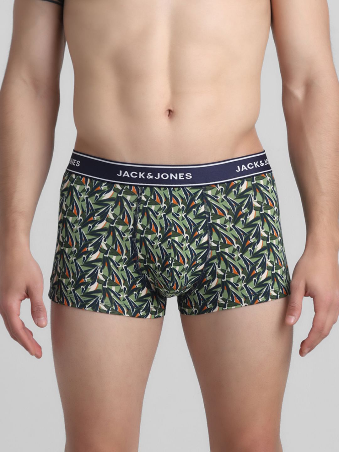 Men's green leaf printed trunks made from premium and soft cotton stretch fabric. Features logo text print on the waist.