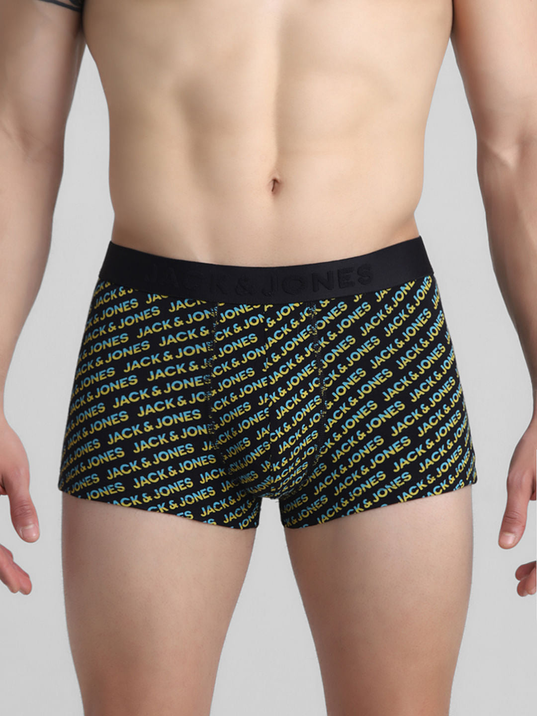 Men's black logo print trunks made from premium and soft cotton stretch fabric. Features logo text print on the waist.