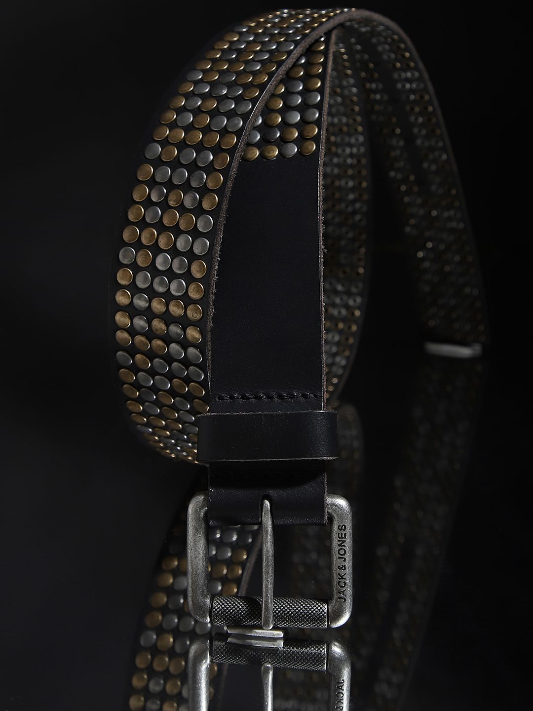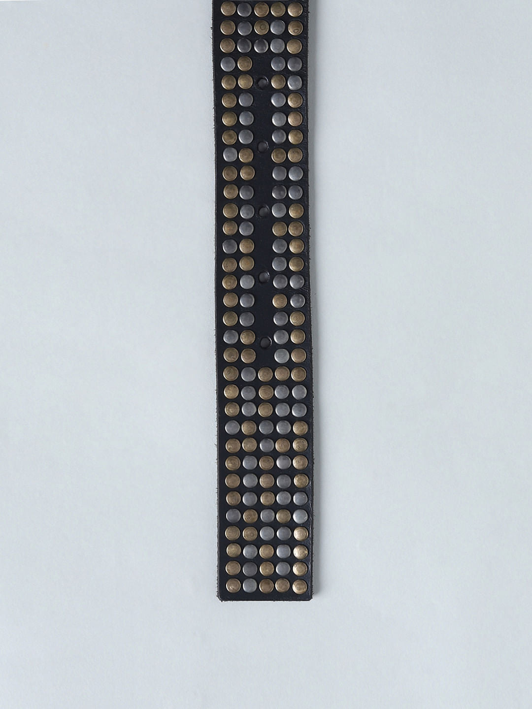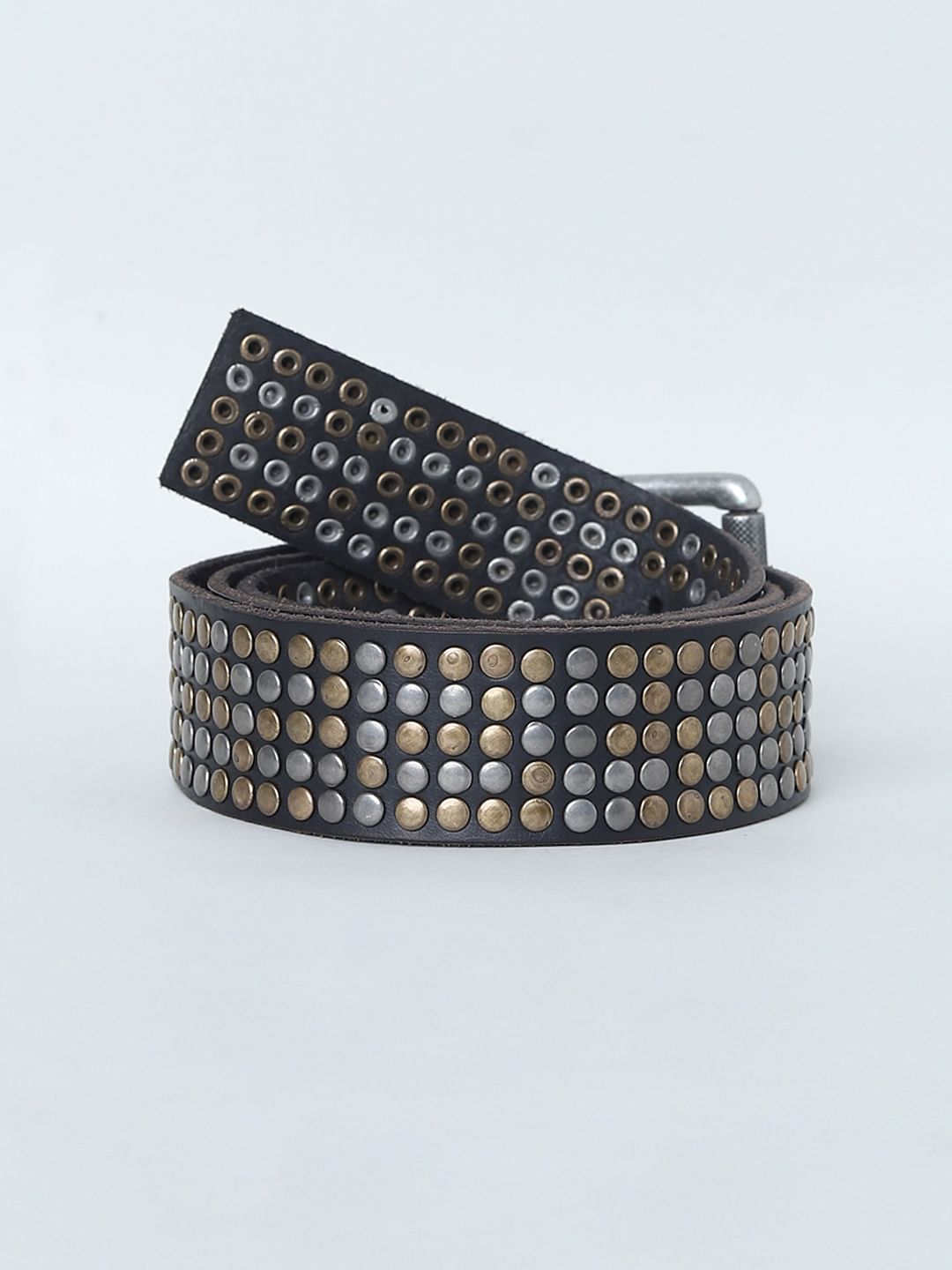 Black leather belt with embellished studs in silver, gold, and bronze. Features a nickel Buckle
