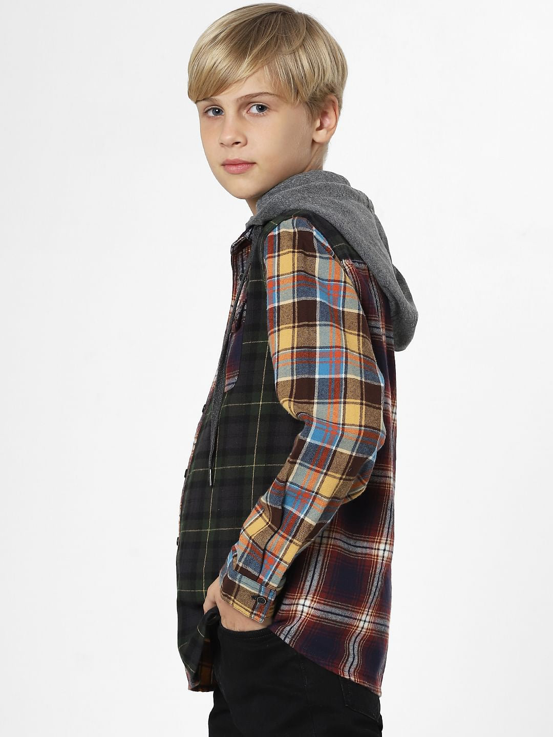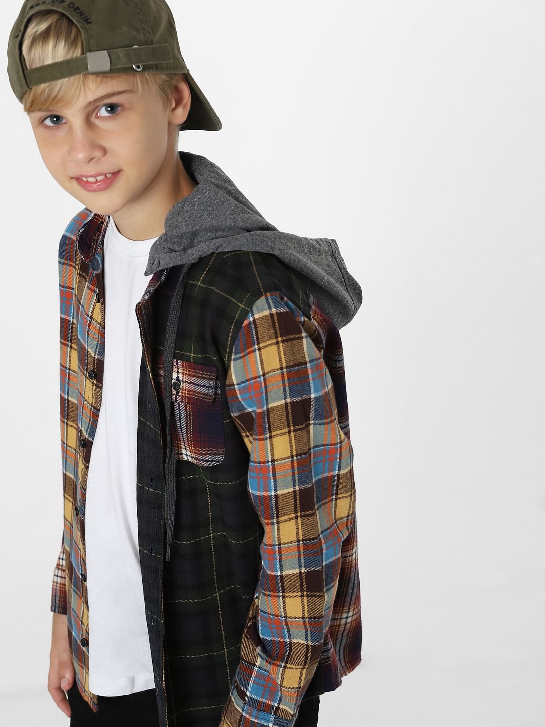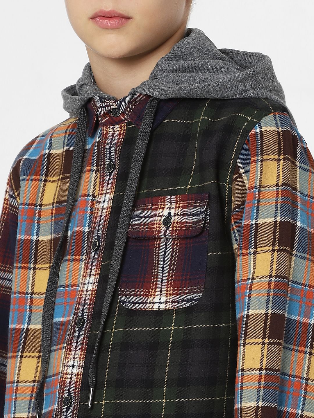 Full sleeves check shirt for little boys. Features a colourblocked hood with drawstrings attached, full sleeves and a front patch pocket. Perfect for styling with denims and sneakers.
