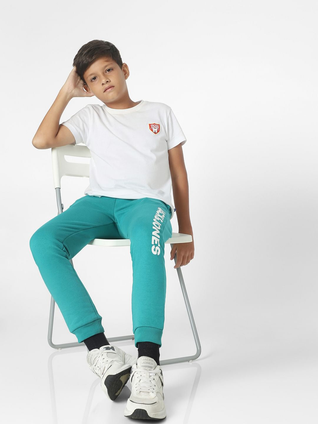 Blue logo print mid rise sweatpants for little boys. Designed with a drawstring waist. Made from premium quality fabric for a good fit & feel. Style with a tee and sneakers.