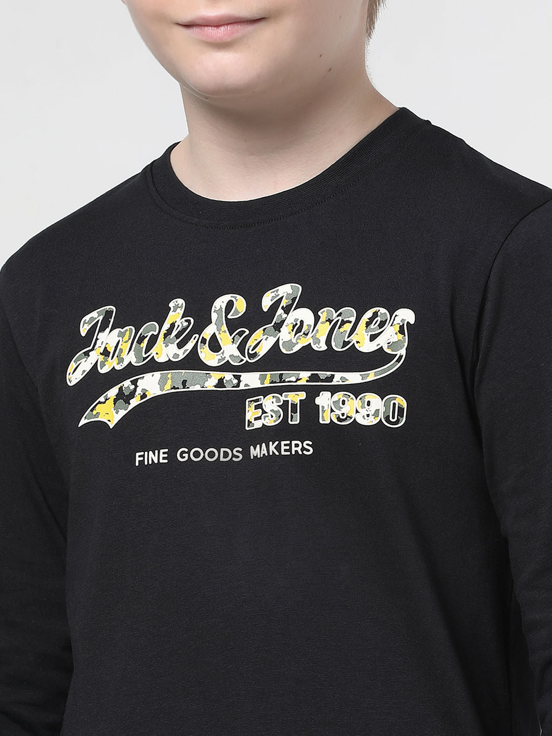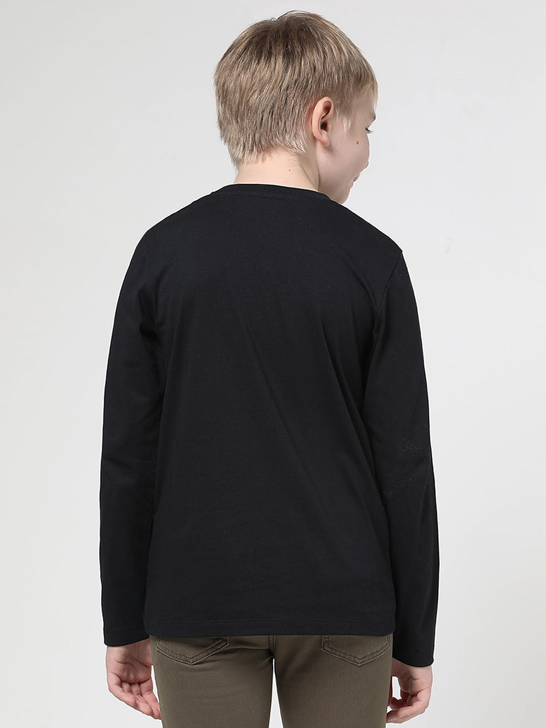 Black logo chest branding print full sleeves t-shirt for little boys. Made from 100% cotton fabric for a comfortable fit and feel. Style it with jeans and sneakers.