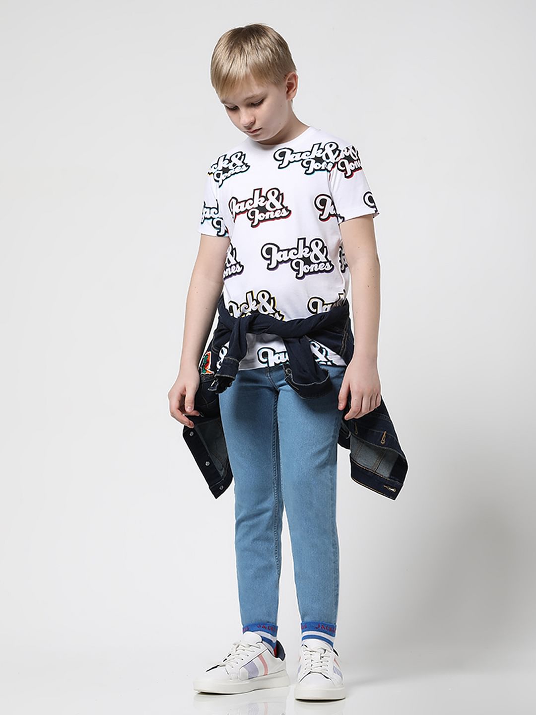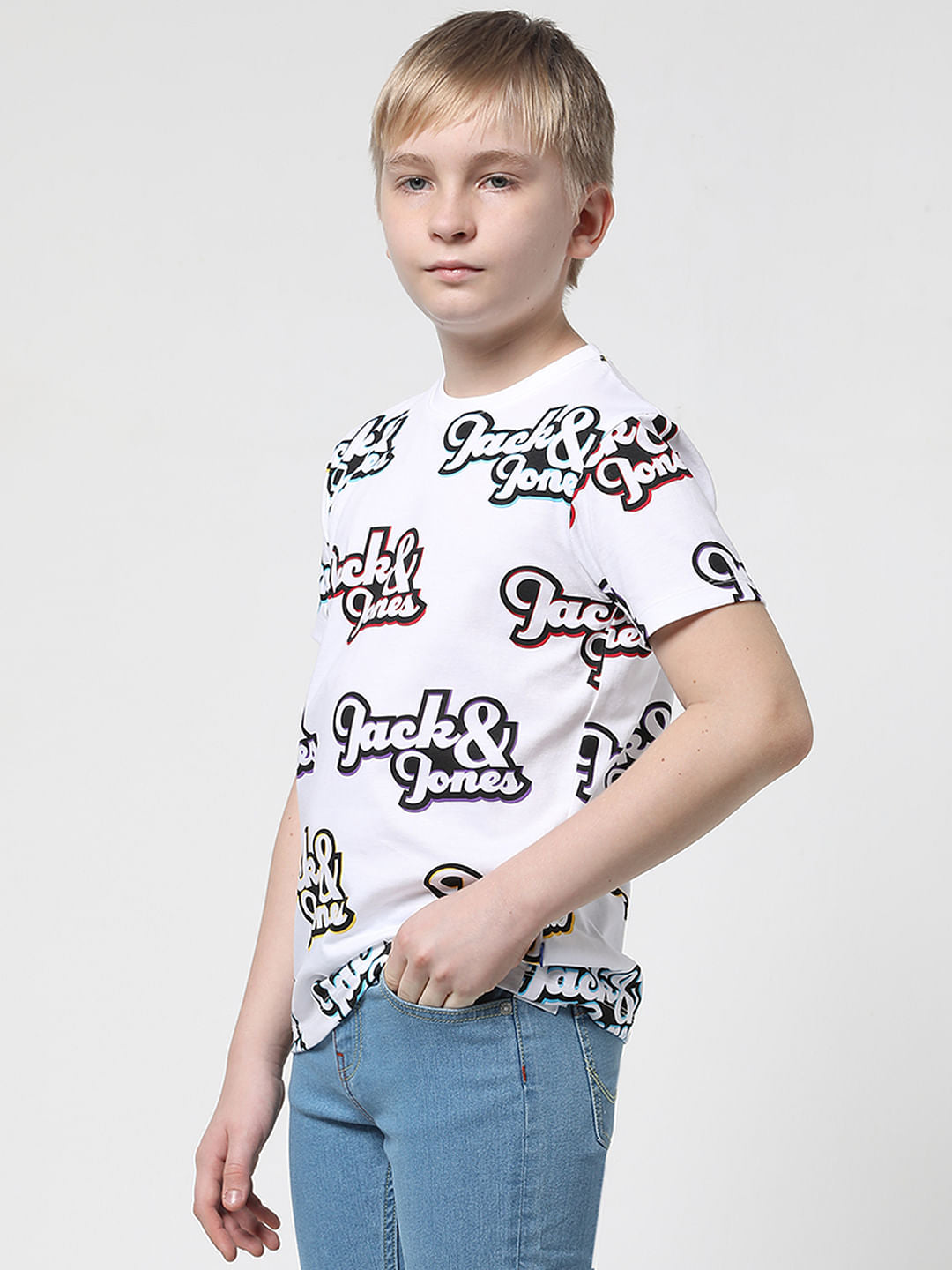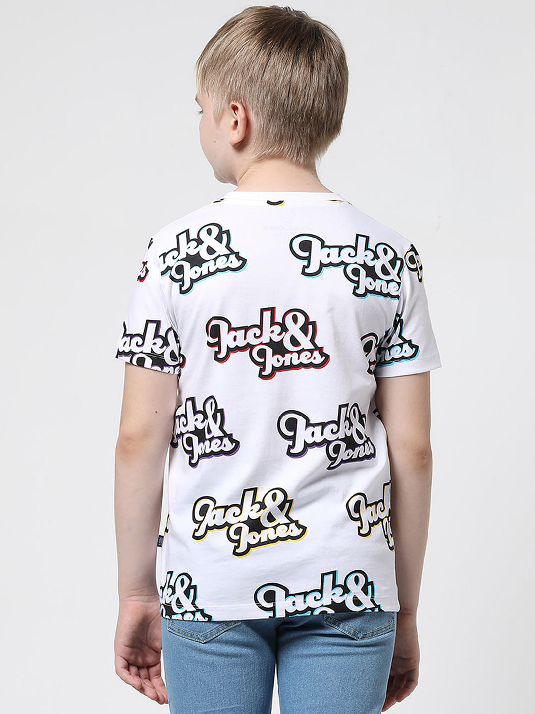 Boys solid white crew neck tee designed with a logo print. Made from 100% cotton fabric for a comfortable fit. Style it with jeans or denim shorts and sneakers.