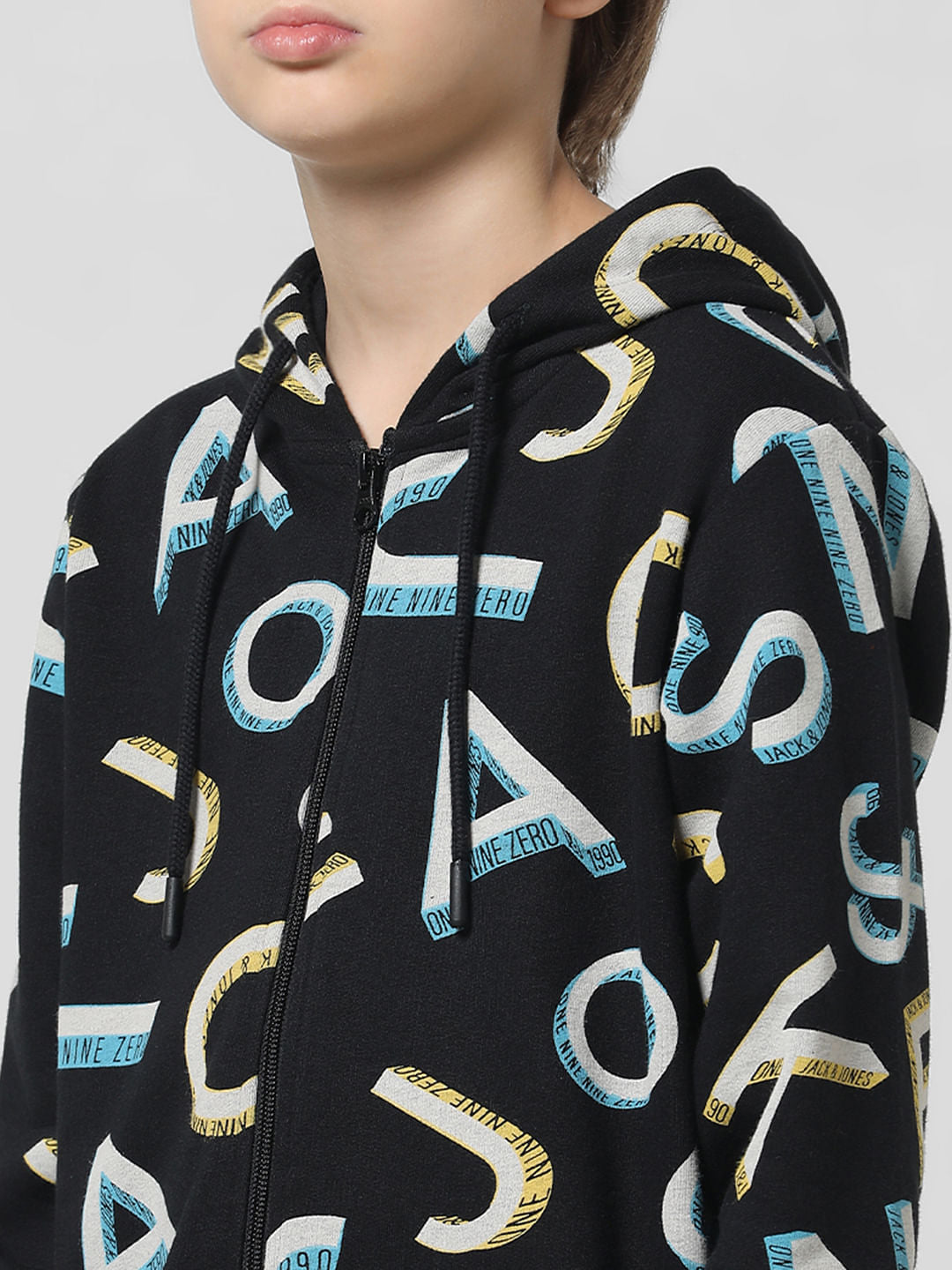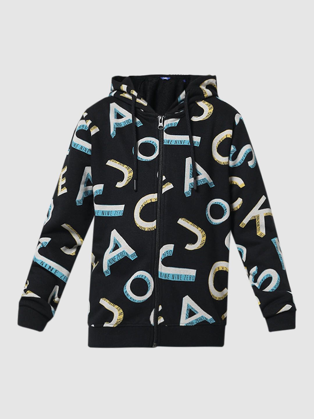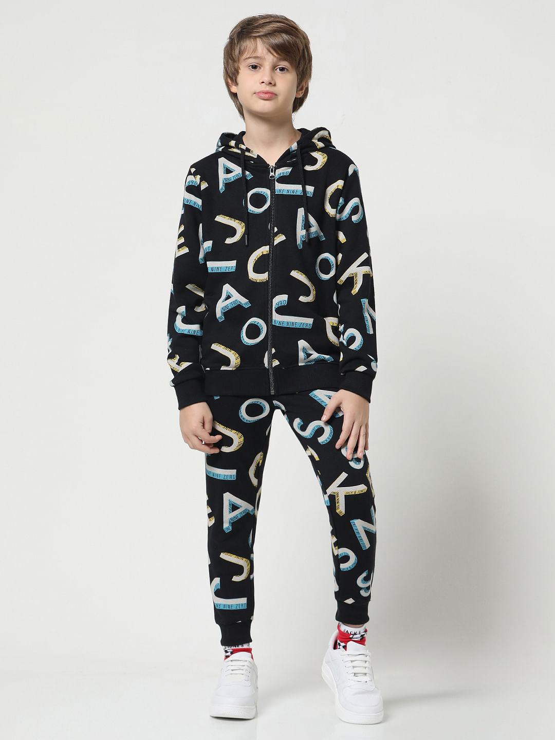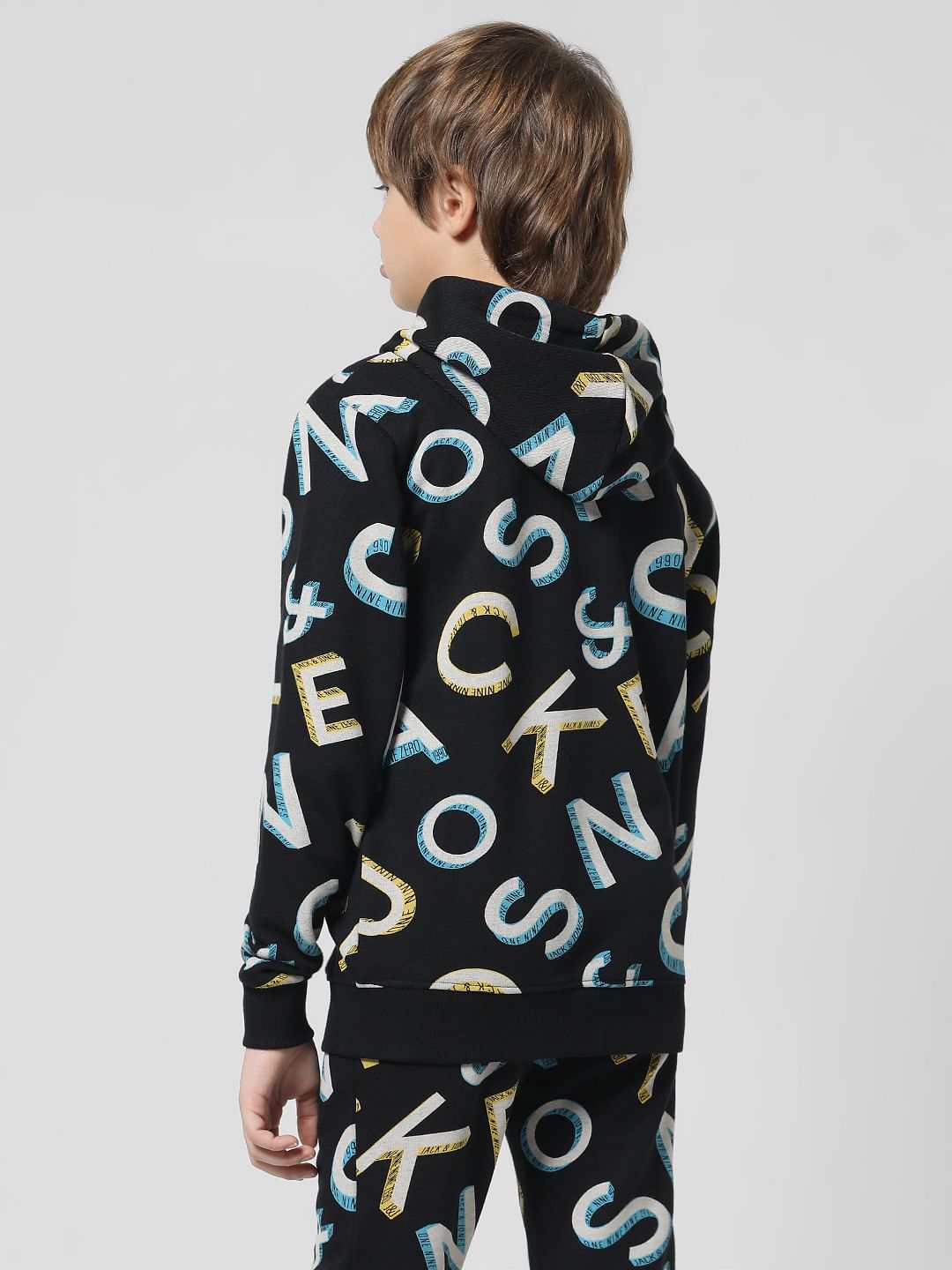 Classic hooded front open sweatshirt for little boys. Made from premium quality fabric and features a hood along with an all over typographic print that gives it added edge. Style it with our matching sweatpants and sneakers for a super cool athleisure vibe!