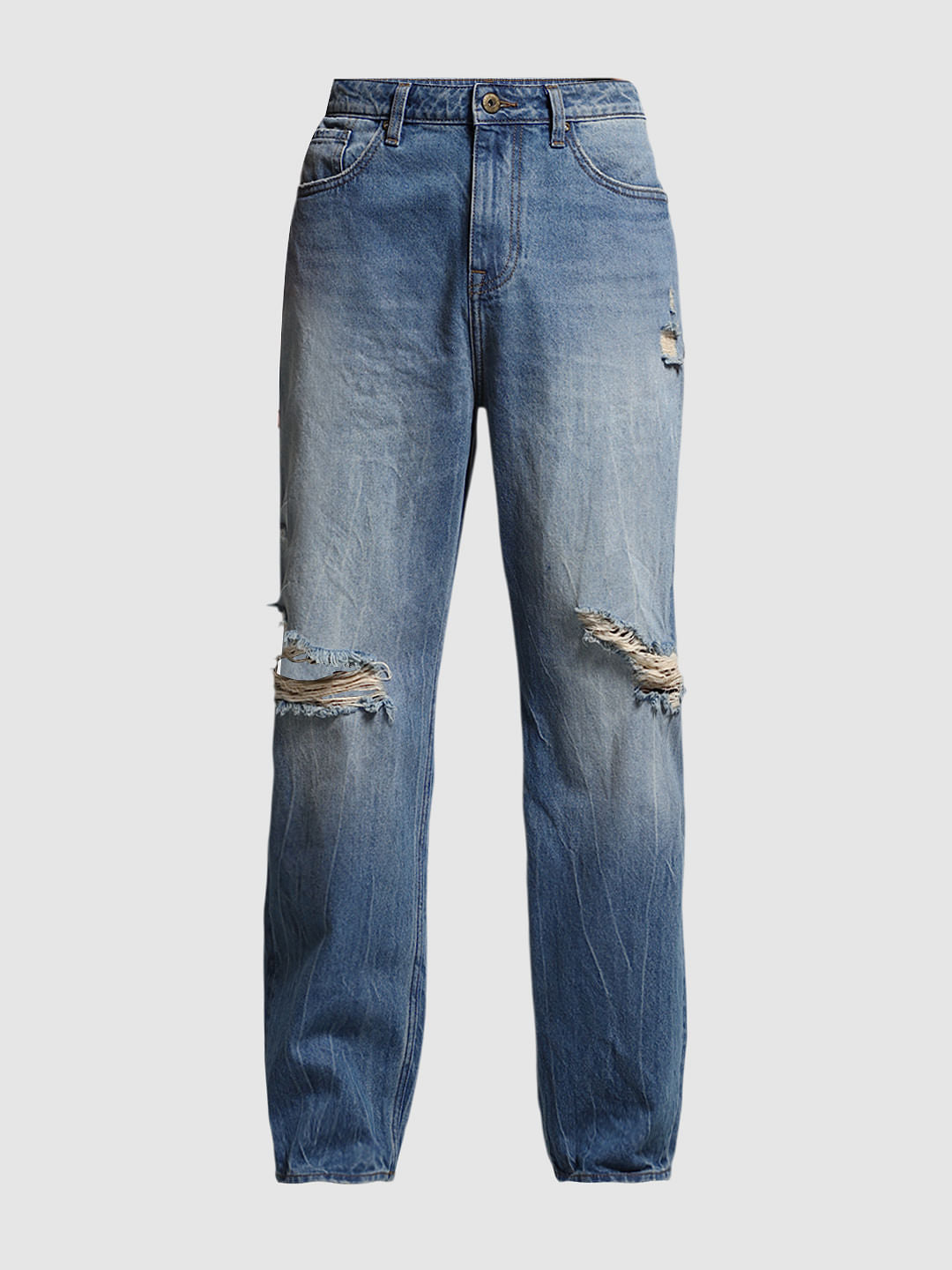 Turn up the cool factor with the Blue Heavily Distressed Dario Loose Fit Jeans. Designed for that effortless, laid-back vibe, these jeans bring a rugged edge with their heavy distressing. Crafted from 100% cotton, they promise all-day comfort while keeping it stylish. The classic 5-pocket detail lets you stash your essentials, and the zip closure makes slipping into your new favourite pair a breeze. Pair them with a tee, sneakers, and a whole lot of attitude!